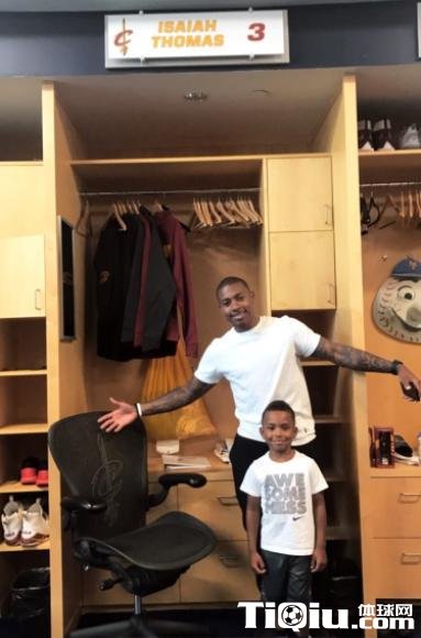 骑士已经为他准备好了新的更衣柜,上面写着“伊塞亚-托马斯,3号”,小托马斯跟儿子站在前面合影,笑得很开心。