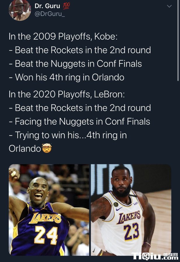 湖人明天将在西部决赛迎战掘金,有网友总结了勒布朗今年季后赛的走向和科比2009年夺冠之旅出现“神同步”——