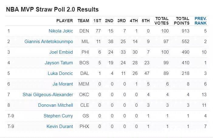 本赛季MVP第二轮模拟投票 约基奇领先字母第二恩比德第三