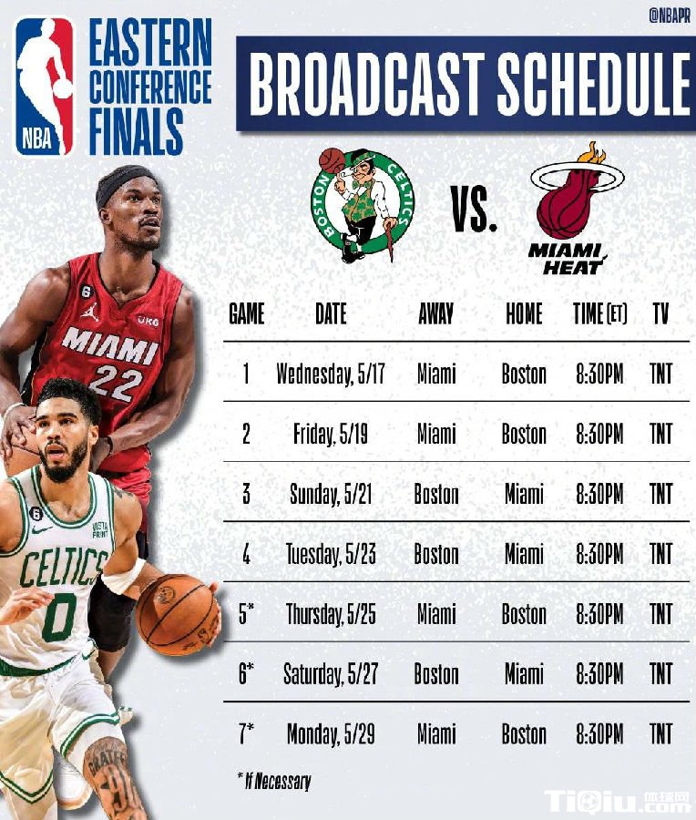 NBA 时间:2023-05-16 14:27来源:编辑:雨后的微笑北京时间5月16日,自从昨日,波士顿凯尔特人在抢七大战中,击败76人队,完成逆转翻盘后晋级东部决赛。东部决赛的小组名单也随即产生,小组的球队名单是:波士顿凯尔特人PK迈哈密热火。而这一轮(东决)系列赛的赛程也跟随着产生。首场G1比赛,将在5月18日早上8:30开打。