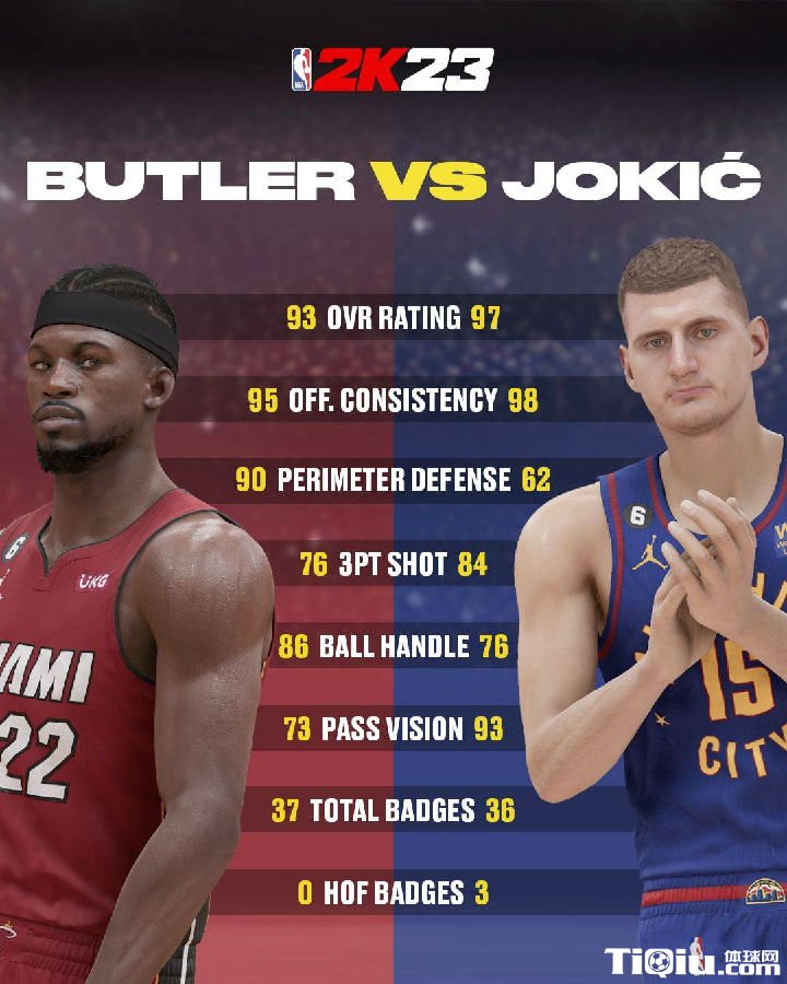 NBA 时间:2023-06-04 22:08来源:编辑:雨后的微笑北京时间6月4日,此前,NBA总决赛系列赛G1比赛已经打完,当前掘金队以104-93战胜热火队,并在大比分上以1-0暂时领先,获得了比赛的开门红。就在今日,2K官方晒出总决赛两支球队的当家球星能力值对比,约基奇97VS巴特勒93。详细细节比较如下: