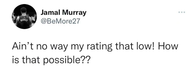 NBA 时间:2023-07-11 13:59来源:编辑:雨后的微笑北京时间7月11日,美媒体晒出了掘金球员在《NBA 2K23》里的评分,这之间,贾马尔·穆雷仅获得84的评分。随后,穆雷在个人社交媒体上更新了最新动态,并发文表示疑惑,自己的评分不可能这么低!会不会游戏设计有问题。队友阿隆也发推表示穆雷至少也要90分以上。