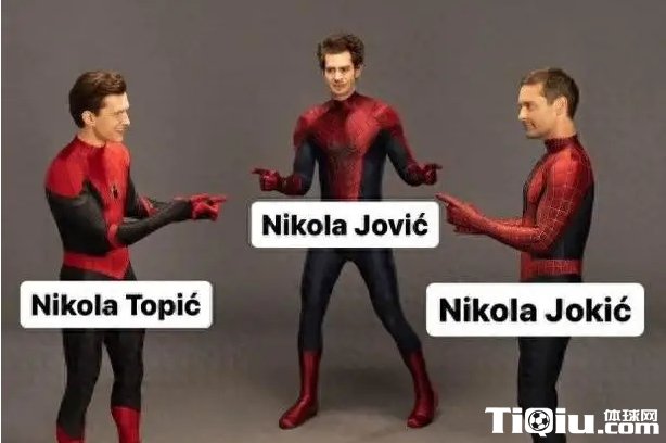 美媒NBA Memes晒出三代蜘蛛侠的照片,三人分别代表尼古拉-约基奇、尼古拉-约维奇和尼古拉-托皮奇。