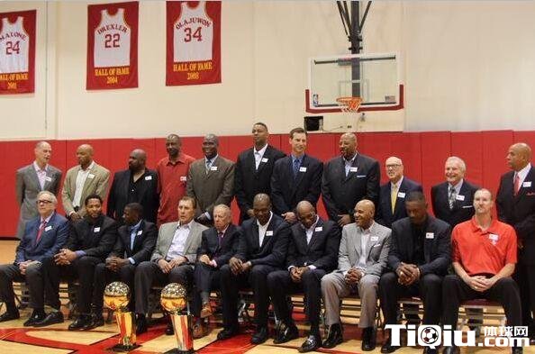 火箭官推贴出了这么一张老照片,球队昔日功勋名宿们分列两排,在他们的跟前,摆放着两座总冠军奖杯。在1994年与1995年,火箭连续摘得桂冠,创造了球队历史上最辉煌的时刻。