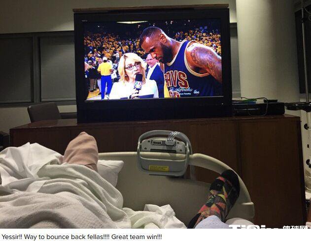 NBA 时间:2015-06-08 16:50来源:未知编辑:初尘【导读】北京时间6月8日 NBA总决赛,骑士加时以95-93险胜勇士,将总比分扳成1-1。而刚刚宣布赛季报销的欧文也在尽自己的一份力,他躺在医院病床上为球队和队友加油助威。场内场外,骑士球员们可以说是众志成城。