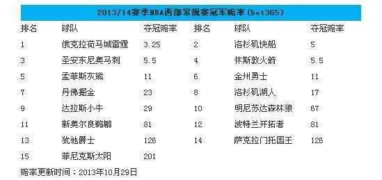 NBA 时间:2013-10-29 13:58来源:未知编辑:帮主【导读】和东部热火轻松做上第一的宝座不同,西部球队要拿到分区冠军势必要经过一番激烈的争夺,马刺、雷霆、快船和今夏新晋的火箭那个都不是可以轻视的对手,那么谁能脱颖而出,在总决赛狙击热火呢?bet365开出的NBA西区夺冠赔率中,雷霆以1比3.25拿下西部的首位,在2014年雷霆极有可能再次挑战热火,一雪前耻。