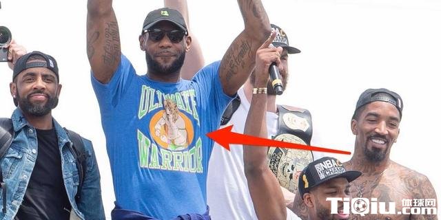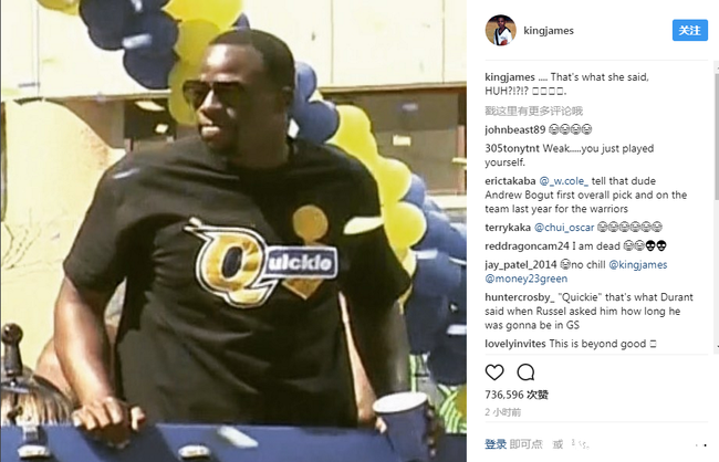 没想到,骑士队当家球星詹姆斯很快就通过IG反击格林,詹姆斯在IG上晒出了一张格林在今天勇士队夺冠游行中的照片,那件T恤格外显眼。同时,詹姆斯在照片旁边写道:“这是她说的,额?”(需要指出的是,quickie有性行为时间短促的意思。詹姆斯用了一句“That‘s what she said”,有调侃格林是“快枪手”的意思)更有趣的是,雷霆队当家球星拉塞尔-威斯布鲁克在詹姆斯的IG下面默默点了一个赞。